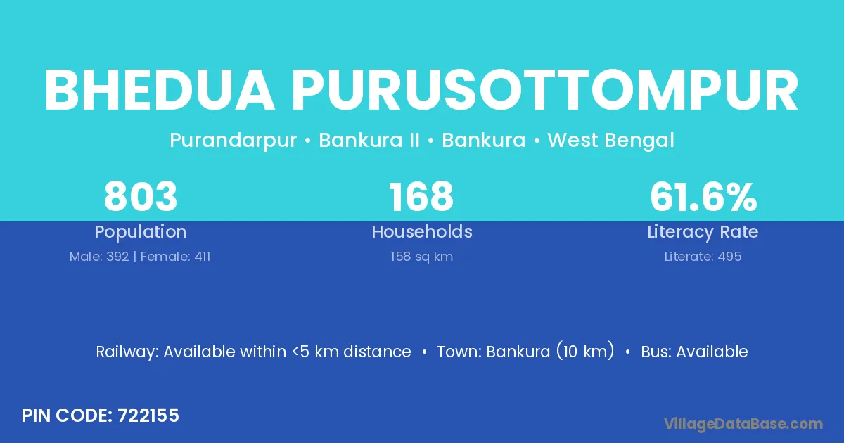 Bankura (10 km) is the nearest town to Bhedua Purusottompur village for major economic activities and is located approximately 10 km away.