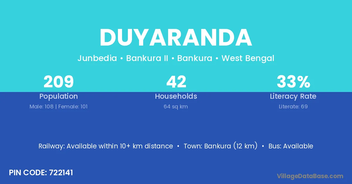 Bankura (12 km) is the nearest town to Duyaranda village for major economic activities and is located approximately 12 km away.