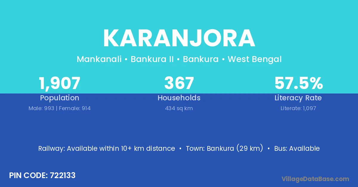 Bankura (29 km) is the nearest town to Karanjora village for major economic activities and is located approximately 29 km away.