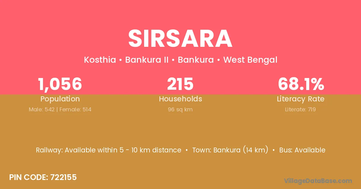 Bankura (14 km) is the nearest town to Sirsara village for major economic activities and is located approximately 14 km away.