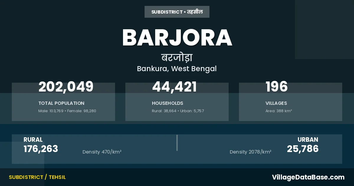 According to the 2011 census The total area of Barjora Subdivision is 388 km², with a population of 202049 people. The population density is 521 inhabitants per square kilometre, and there are approximately 44421 houses in the sub district.