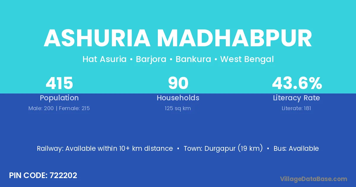 Durgapur (19 km) is the nearest town to Ashuria Madhabpur village for major economic activities and is located approximately 19 km away.