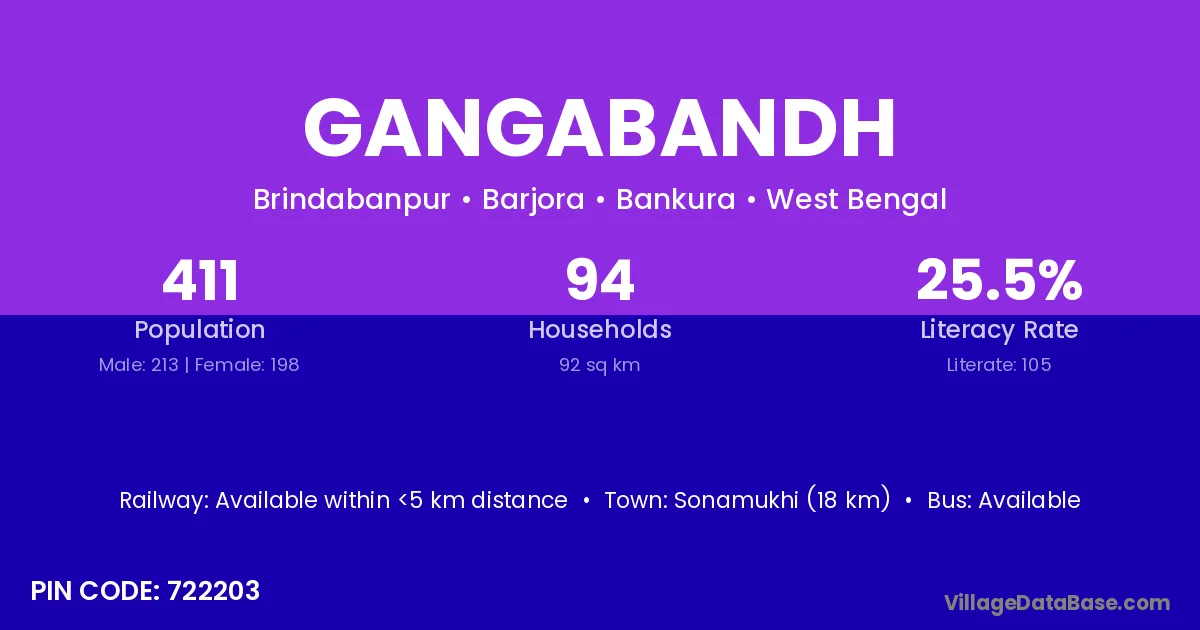 Sonamukhi (18 km) is the nearest town to Gangabandh village for major economic activities and is located approximately 18 km away.