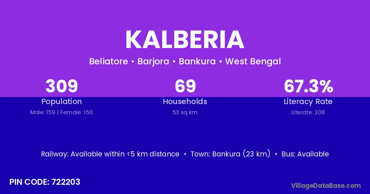 Bankura (23 km) is the nearest town to Kalberia village for major economic activities and is located approximately 23 km away.