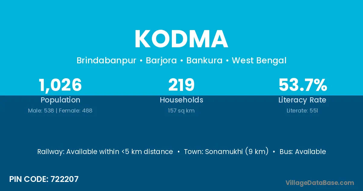 Sonamukhi (9 km) is the nearest town to Kodma village for major economic activities and is located approximately 9 km away.
