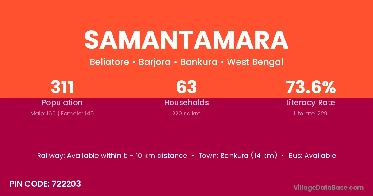 Bankura (14 km) is the nearest town to Samantamara village for major economic activities and is located approximately 14 km away.