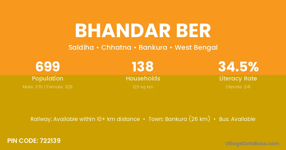 Bankura (26 km) is the nearest town to Bhandar Ber village for major economic activities and is located approximately 26 km away.