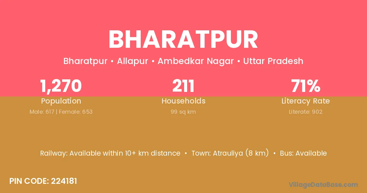 Bharatpur village has a total population of 403 people, of which 211 are males and 192 are females.