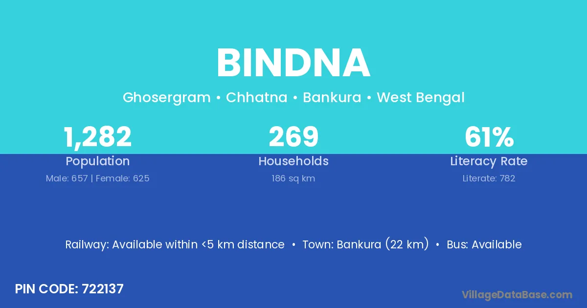 Bankura (22 km) is the nearest town to Bindna village for major economic activities and is located approximately 22 km away.