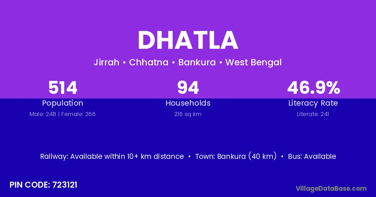 Bankura (40 km) is the nearest town to Dhatla village for major economic activities and is located approximately 40 km away.