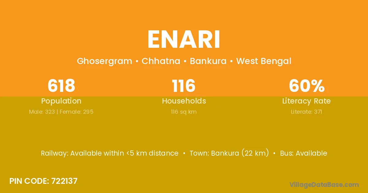 Bankura (22 km) is the nearest town to Enari village for major economic activities and is located approximately 22 km away.