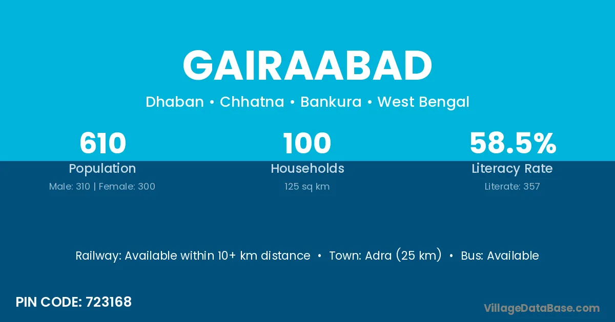 Adra (25 km) is the nearest town to Gairaabad village for major economic activities and is located approximately 25 km away.