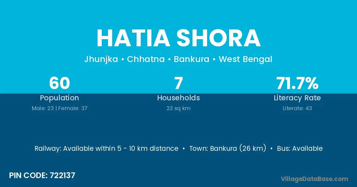 Bankura (26 km) is the nearest town to Hatia Shora village for major economic activities and is located approximately 26 km away.