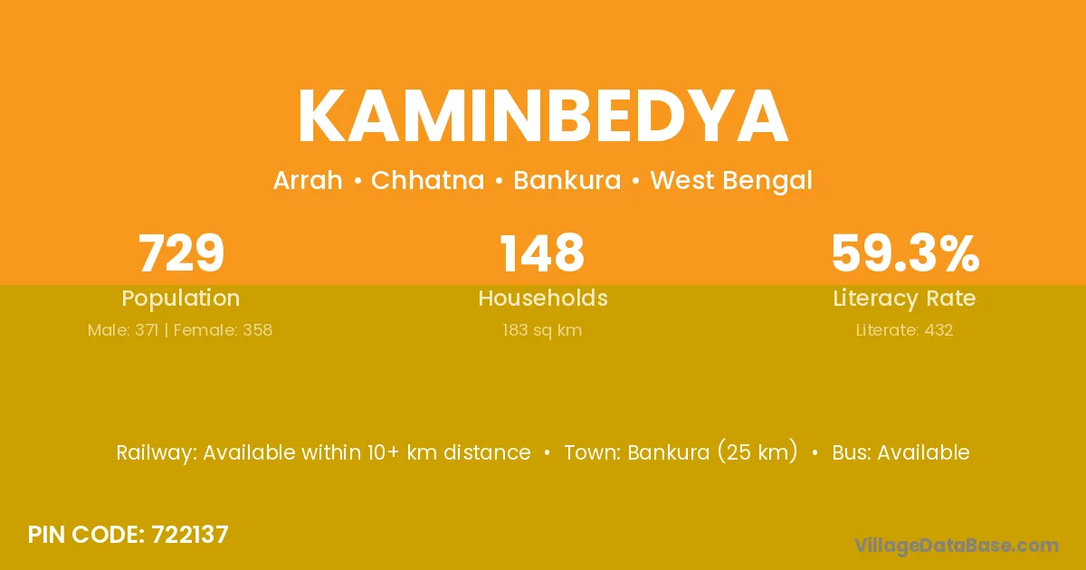 Bankura (25 km) is the nearest town to Kaminbedya village for major economic activities and is located approximately 25 km away.