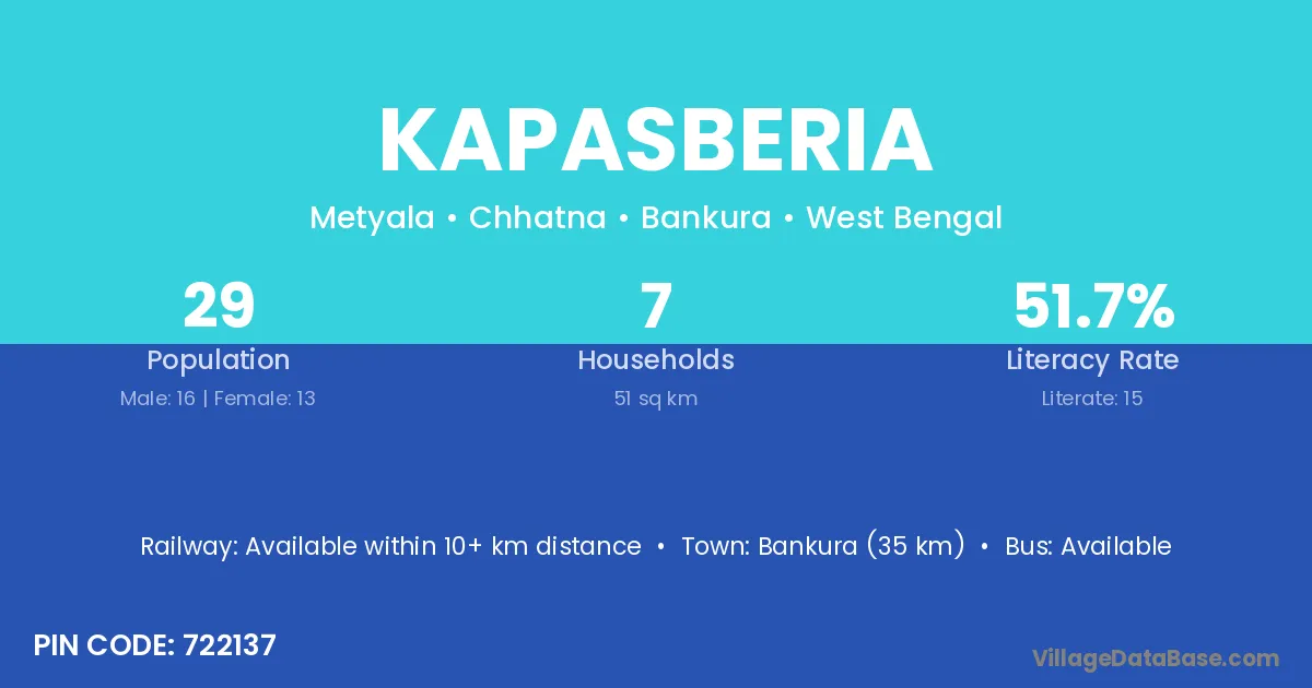 Bankura (35 km) is the nearest town to Kapasberia village for major economic activities and is located approximately 35 km away.
