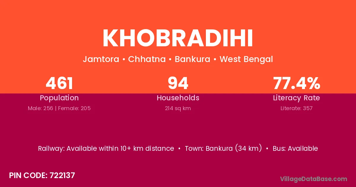 Bankura (34 km) is the nearest town to Khobradihi village for major economic activities and is located approximately 34 km away.