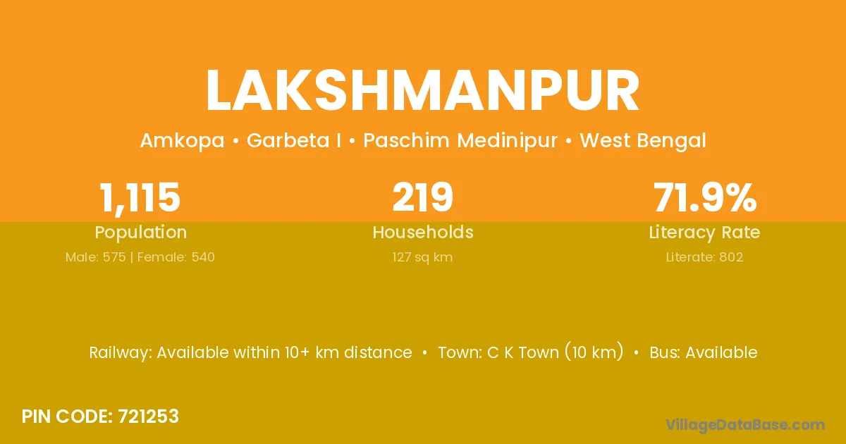 Bankkura (30 km) is the nearest town to Lakshmanpur village for major economic activities and is located approximately 30 km away.