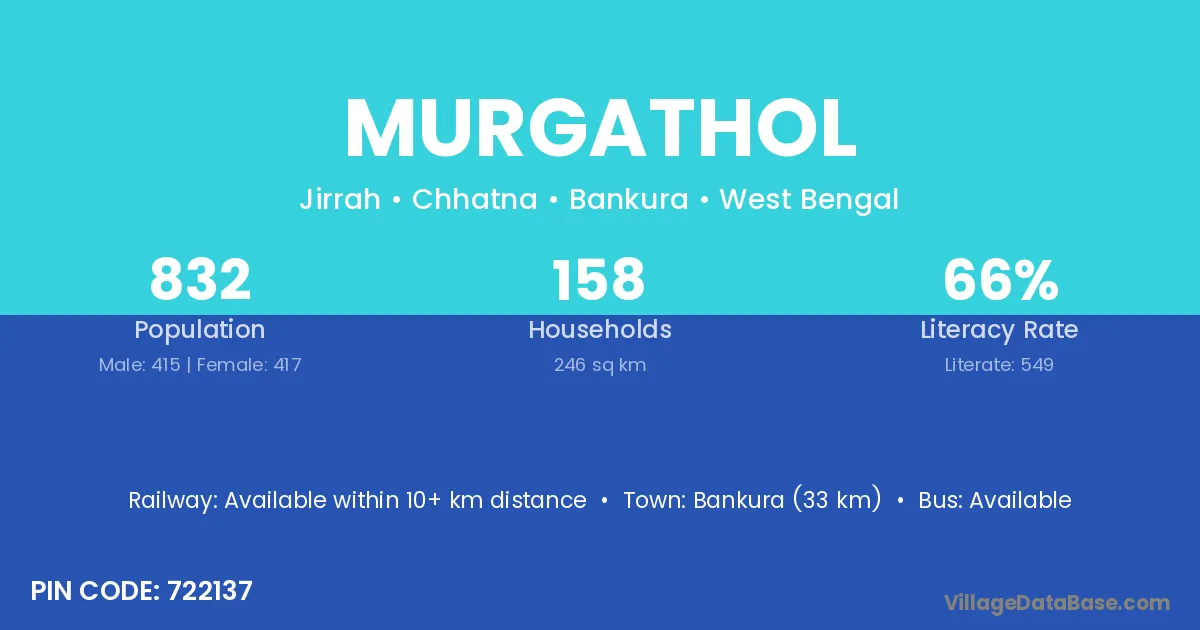 Bankura (33 km) is the nearest town to Murgathol village for major economic activities and is located approximately 33 km away.