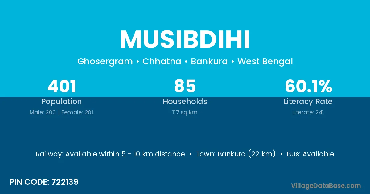 Bankura (22 km) is the nearest town to Musibdihi village for major economic activities and is located approximately 22 km away.