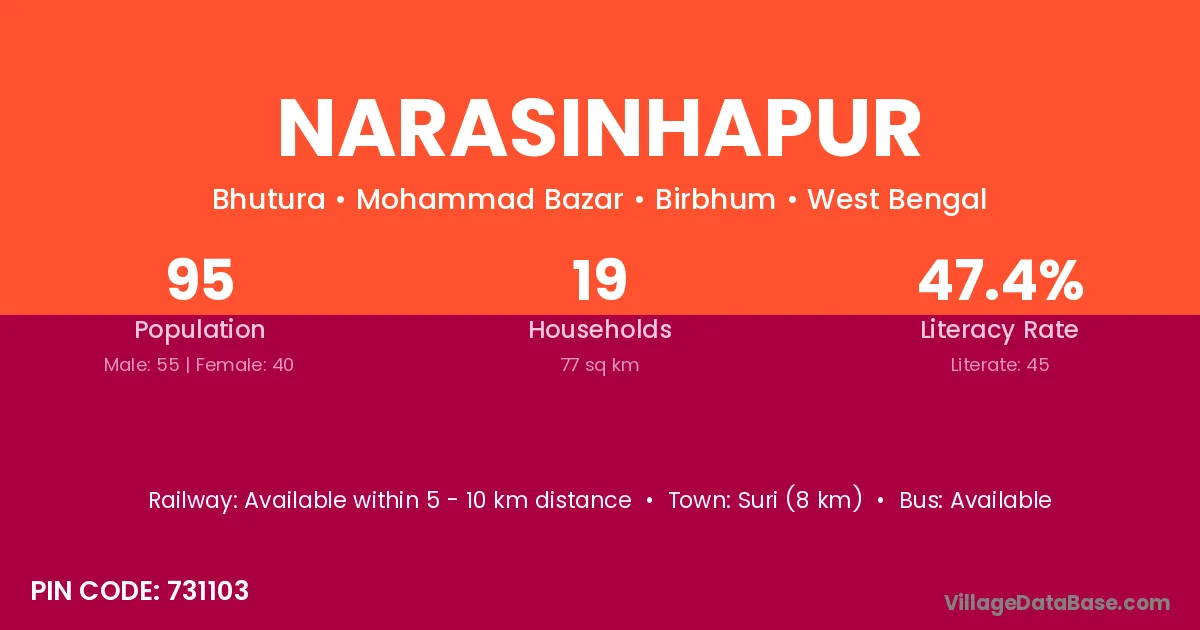 Bankura (24 km) is the nearest town to Narasinhapur village for major economic activities and is located approximately 24 km away.