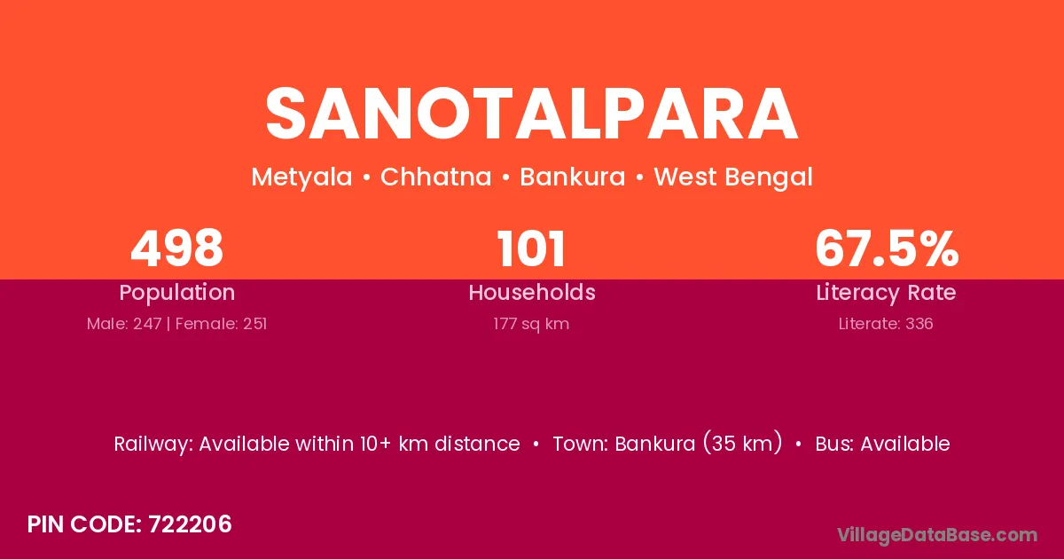 Bankura (35 km) is the nearest town to Sanotalpara village for major economic activities and is located approximately 35 km away.