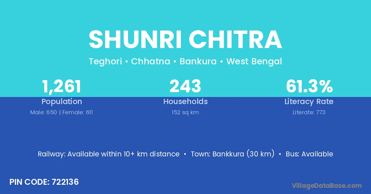 Bankkura (30 km) is the nearest town to Shunri Chitra village for major economic activities and is located approximately 30 km away.