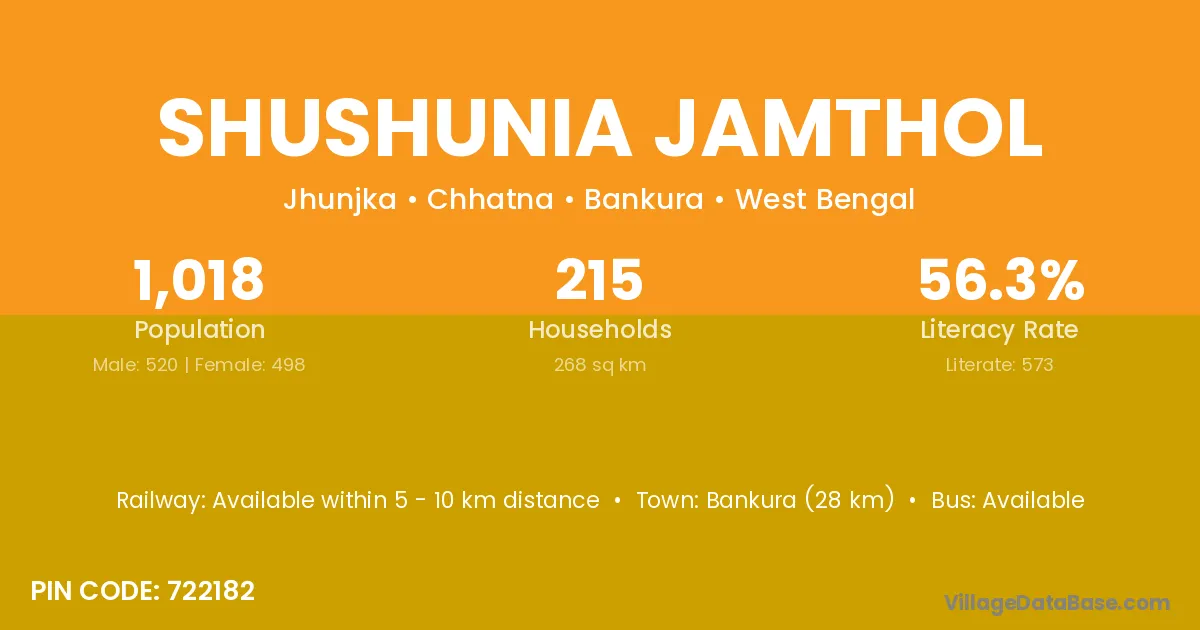 Bankura (28 km) is the nearest town to Shushunia Jamthol village for major economic activities and is located approximately 28 km away.