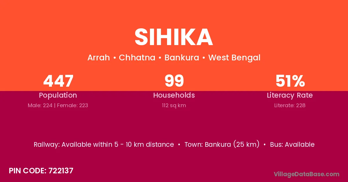 Bankura (25 km) is the nearest town to Sihika village for major economic activities and is located approximately 25 km away.