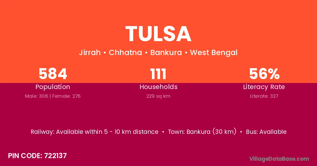 Bankura (30 km) is the nearest town to Tulsa village for major economic activities and is located approximately 30 km away.