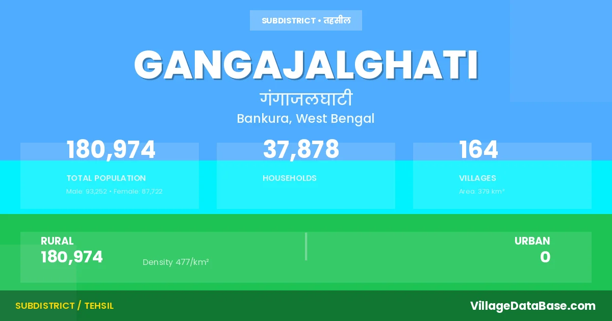 According to the 2011 census The total area of Gangajalghati Subdivision is 379 km², with a population of 180974 people. The population density is 477 inhabitants per square kilometre, and there are approximately 37878 houses in the sub district.