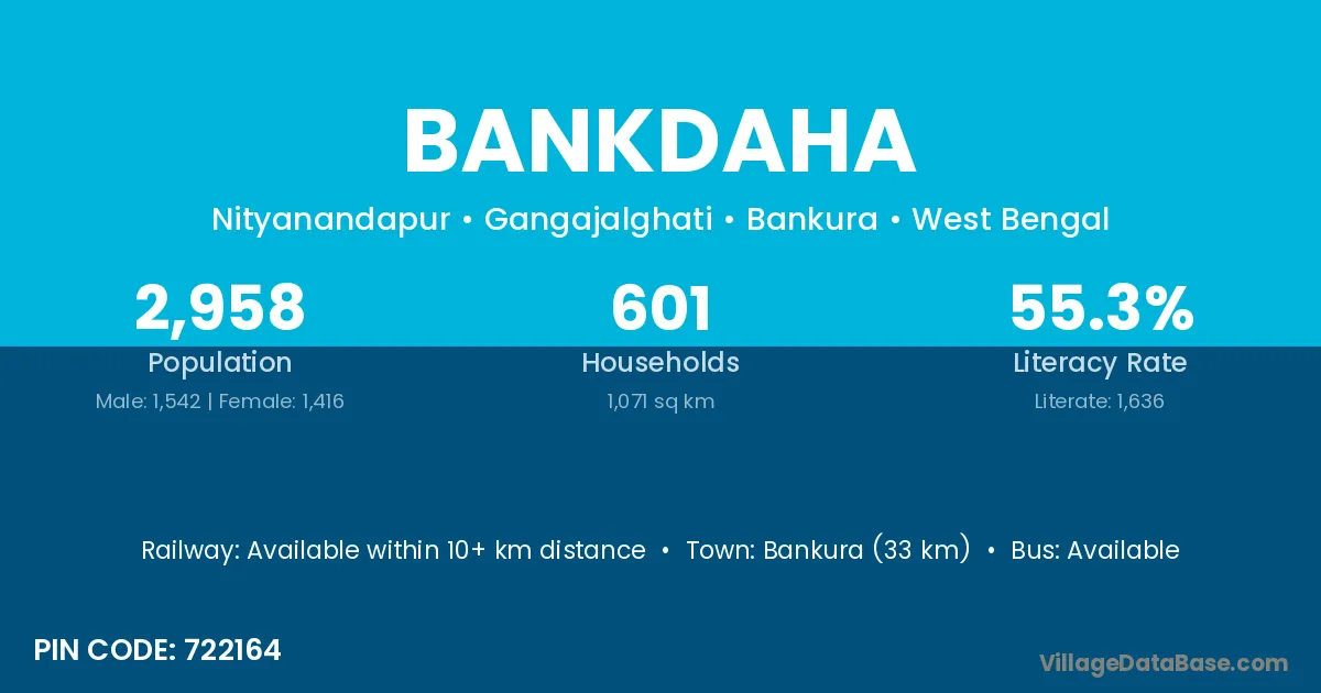 Bankura (33 km) is the nearest town to Bankdaha village for major economic activities and is located approximately 33 km away.