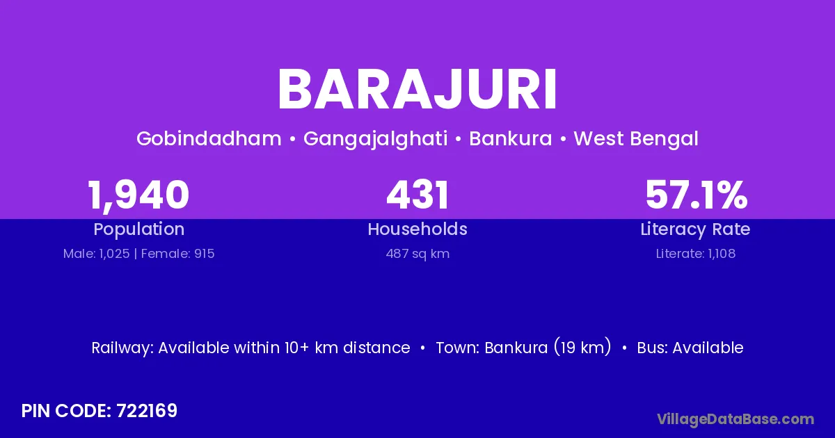 Bankura (19 km) is the nearest town to Barajuri village for major economic activities and is located approximately 19 km away.