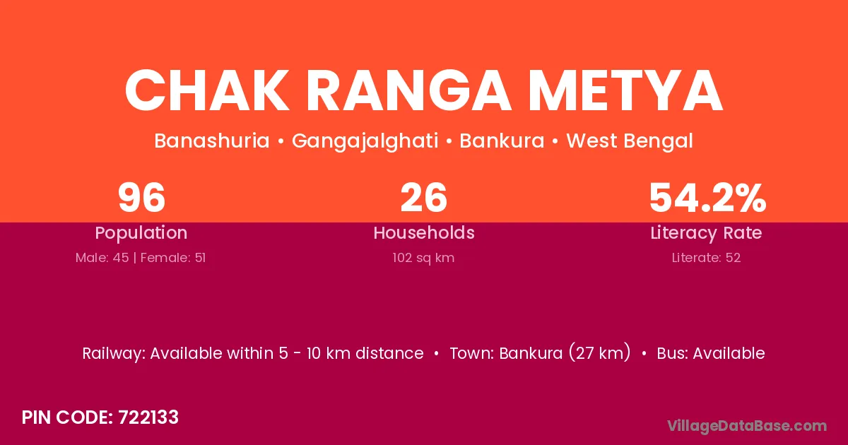Bankura (27 km) is the nearest town to Chak Ranga Metya village for major economic activities and is located approximately 27 km away.