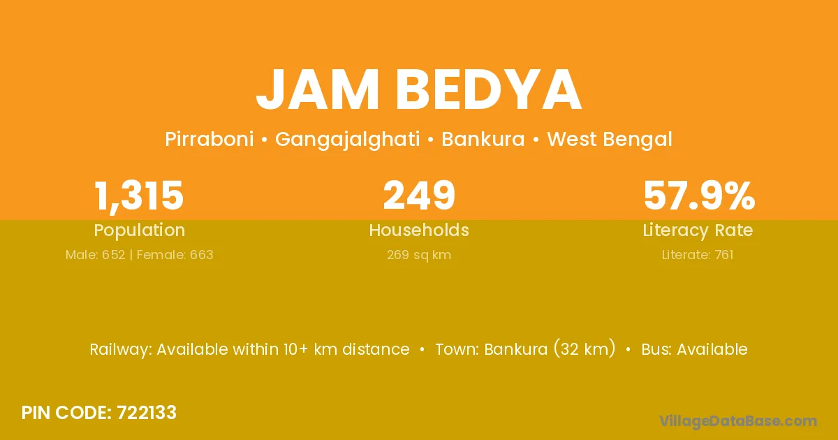 Bankura (32 km) is the nearest town to Jam Bedya village for major economic activities and is located approximately 32 km away.