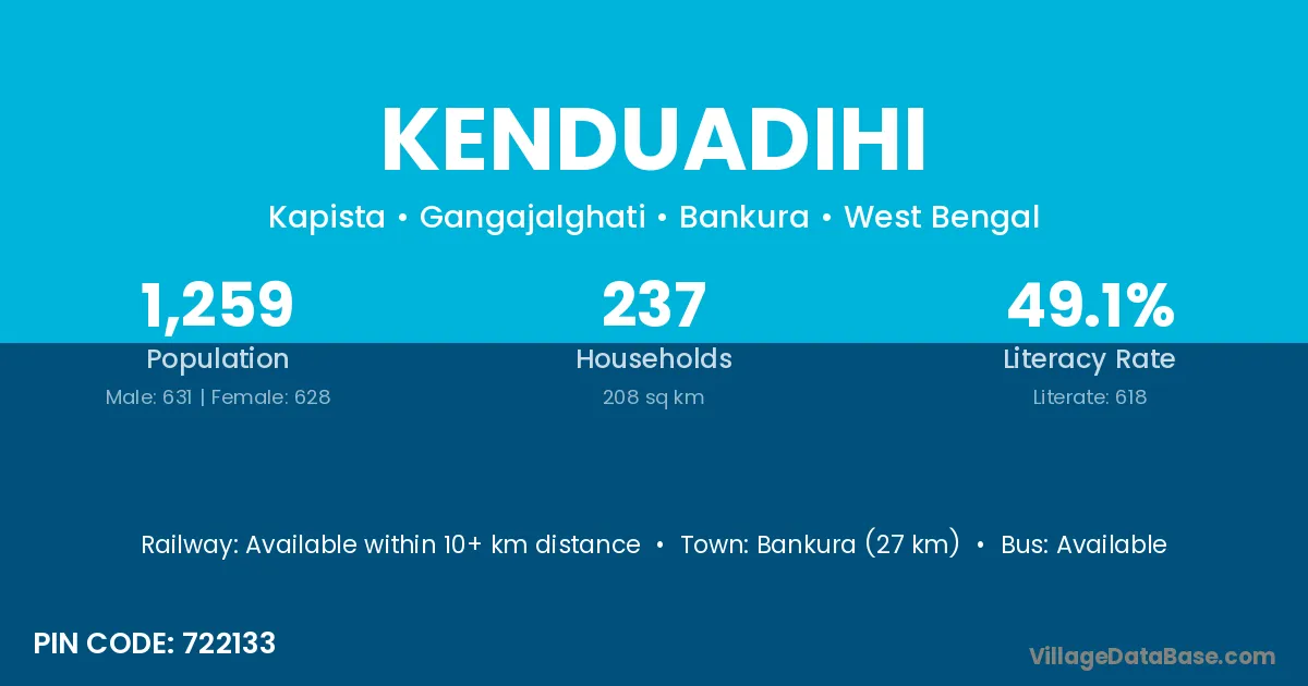 Bankura (27 km) is the nearest town to Kenduadihi village for major economic activities and is located approximately 27 km away.