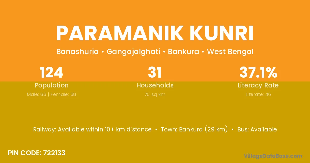 Bankura (29 km) is the nearest town to Paramanik Kunri village for major economic activities and is located approximately 29 km away.