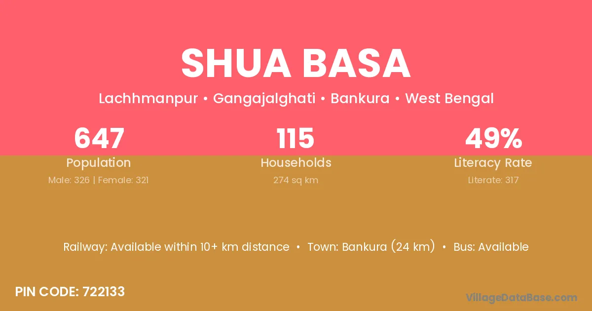 Bankura (24 km) is the nearest town to Shua Basa village for major economic activities and is located approximately 24 km away.
