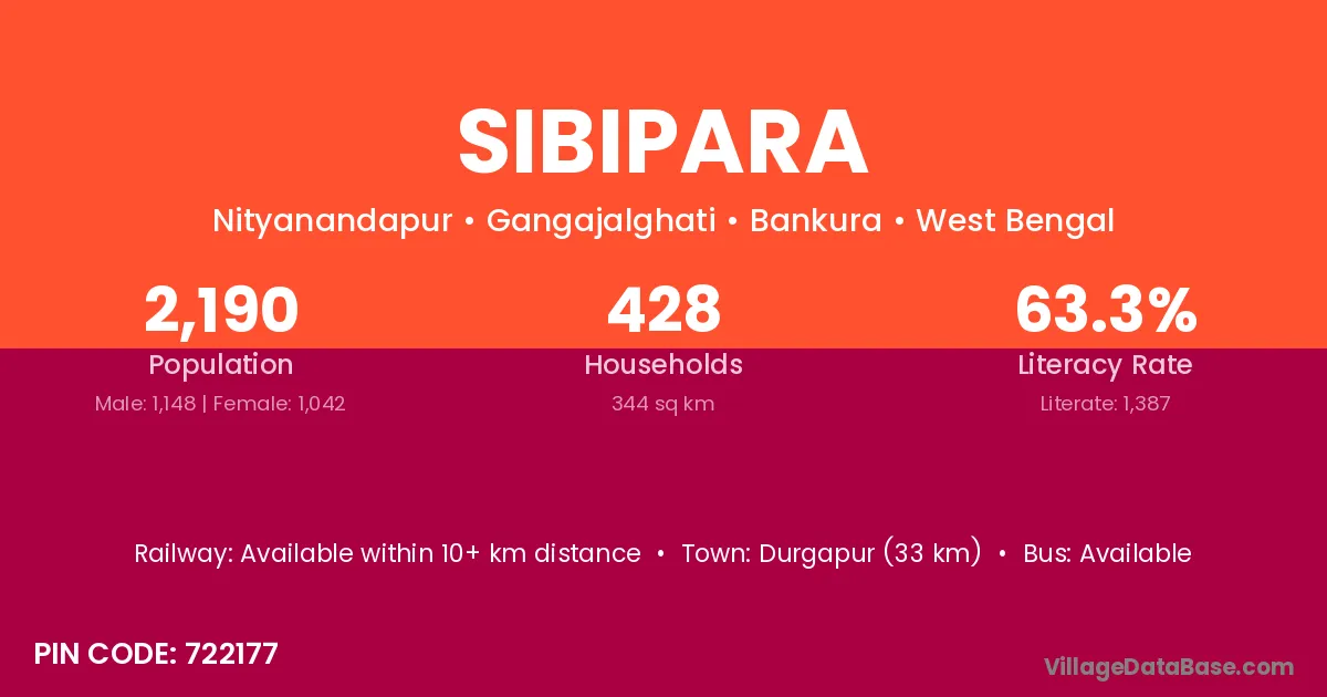 Durgapur (33 km) is the nearest town to Sibipara village for major economic activities and is located approximately 33 km away.