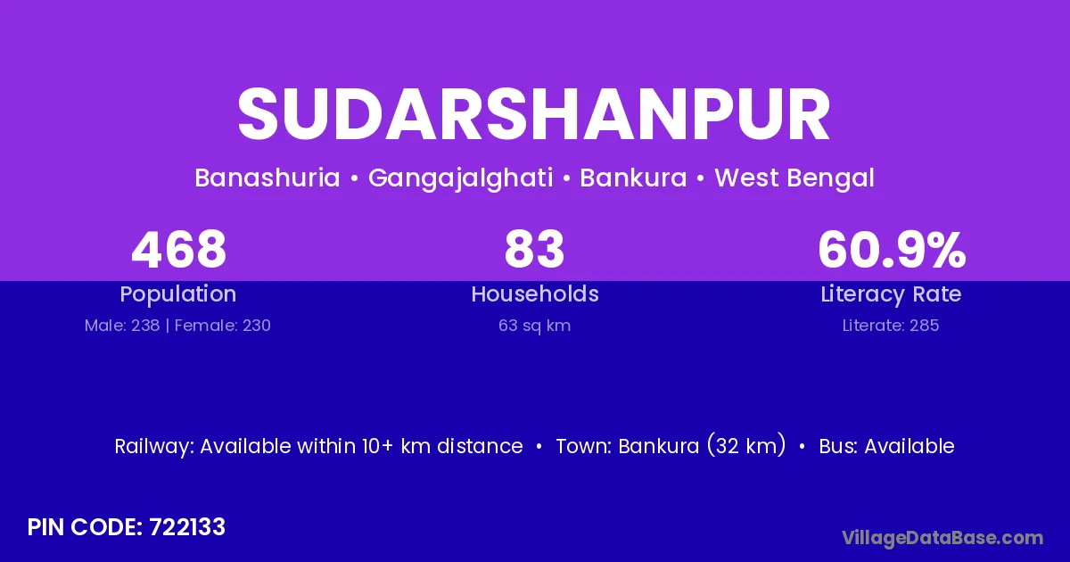 Bankura (32 km) is the nearest town to Sudarshanpur village for major economic activities and is located approximately 32 km away.
