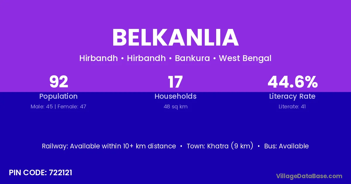 Khatra (9 km) is the nearest town to Belkanlia village for major economic activities and is located approximately 9 km away.
