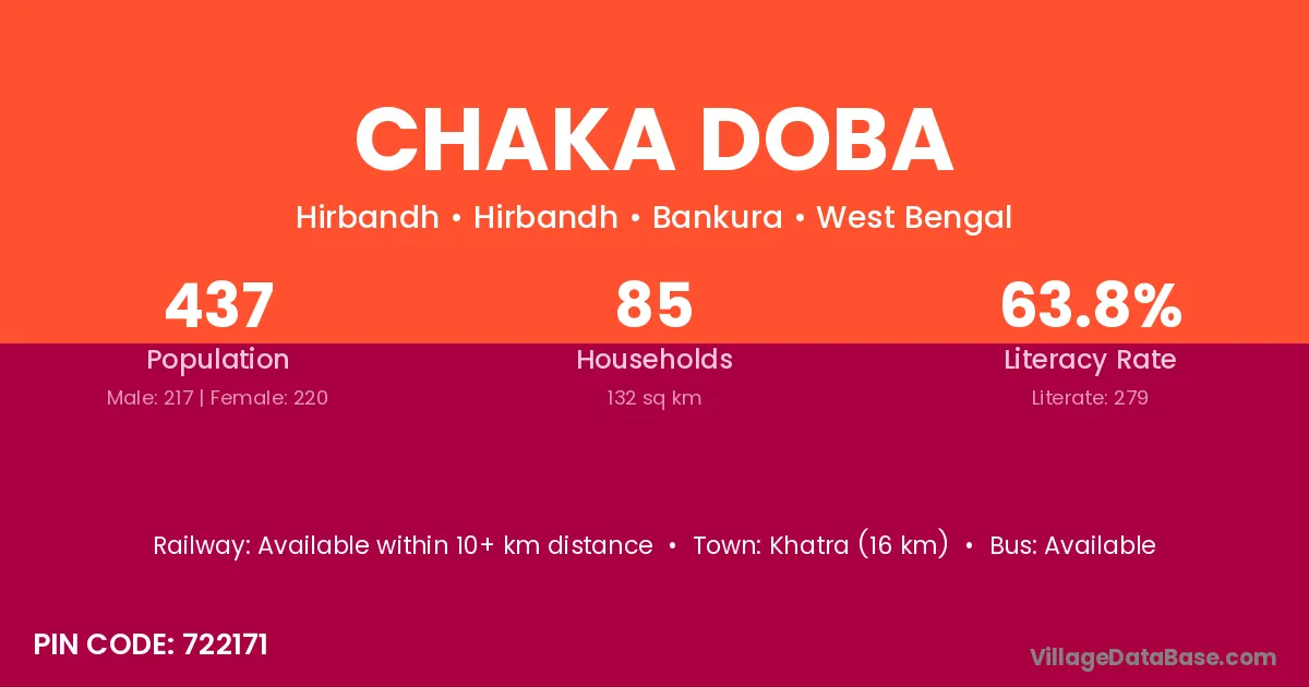 Khatra (16 km) is the nearest town to Chaka Doba village for major economic activities and is located approximately 16 km away.