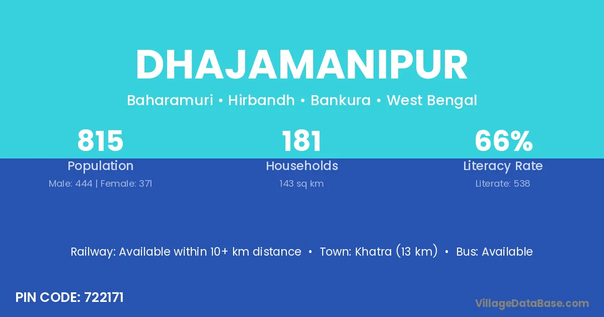 Khatra (13 km) is the nearest town to Dhajamanipur village for major economic activities and is located approximately 13 km away.