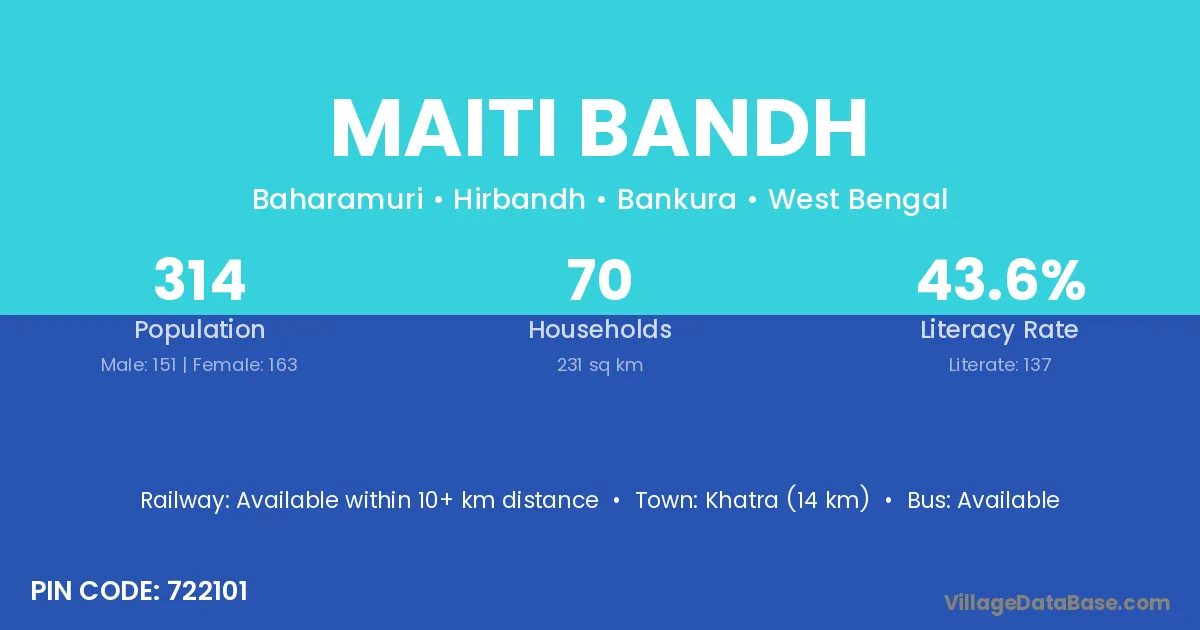 Khatra (14 km) is the nearest town to Maiti Bandh village for major economic activities and is located approximately 14 km away.