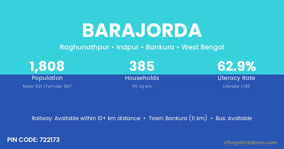 Bankura (11 km) is the nearest town to Barajorda village for major economic activities and is located approximately 11 km away.