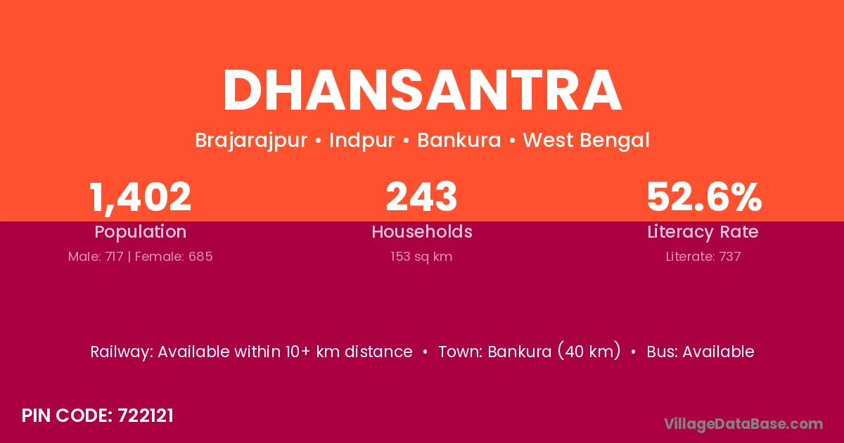 Bankura (40 km) is the nearest town to Dhansantra village for major economic activities and is located approximately 40 km away.