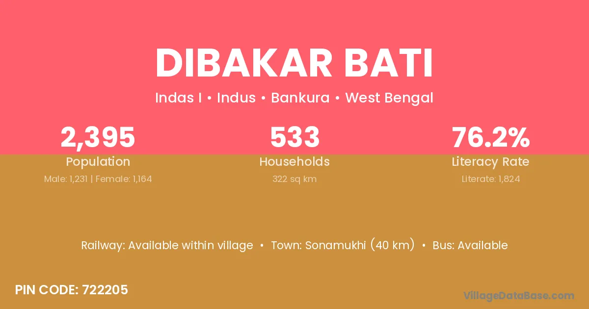 Sonamukhi (40 km) is the nearest town to Dibakar Bati village for major economic activities and is located approximately 40 km away.