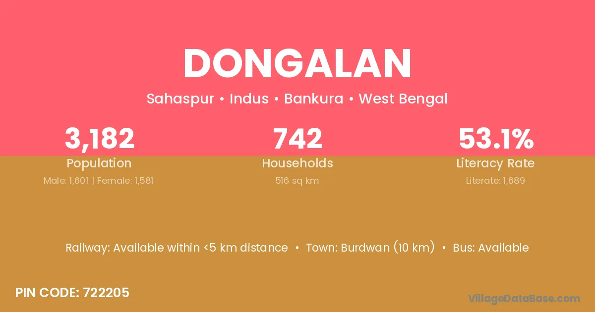 Burdwan (10 km) is the nearest town to Dongalan village for major economic activities and is located approximately 10 km away.