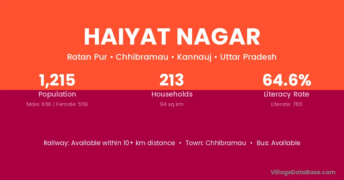 The literacy rate of Haiyat Nagar village is 58.41%. Male literacy stands at 64.76% and female literacy at 51.72%.