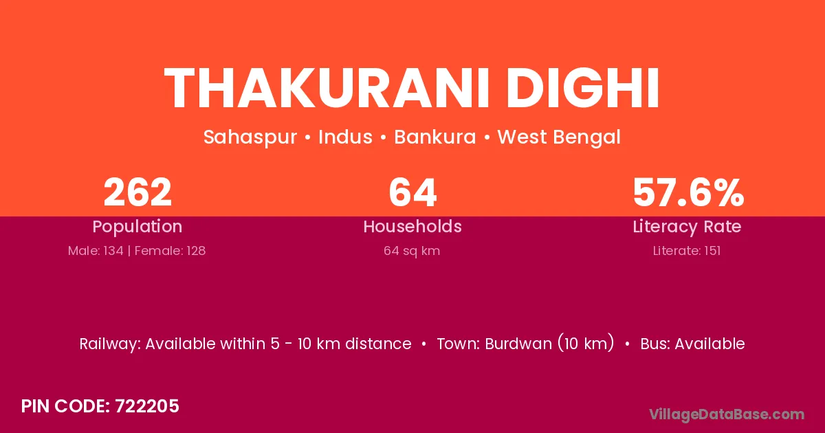 Burdwan (10 km) is the nearest town to Thakurani Dighi village for major economic activities and is located approximately 10 km away.