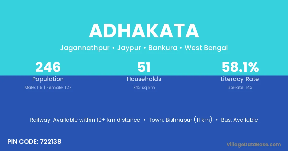 Bishnupur (11 km) is the nearest town to Adhakata village for major economic activities and is located approximately 11 km away.